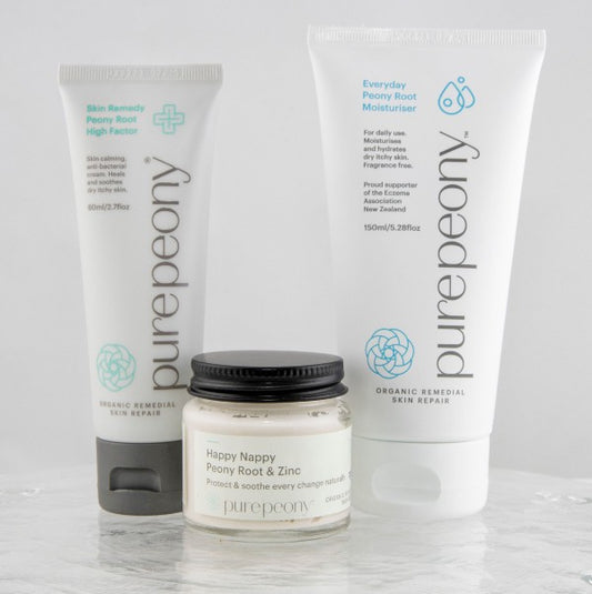 We recommend using our High Factor Peony Root Skin Remedy on patches of irritated, red, and/or itchy skin 2 - 3 times a day.  You can also use our Peony and Calendula cream at night for a thicker richer cream. Use Happy Nappy cream at every nappy change to prevent and help heal any nappy rash. Shop our full range
